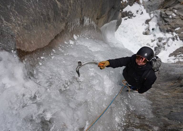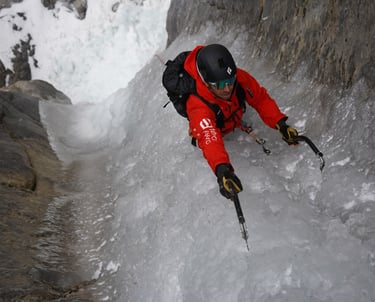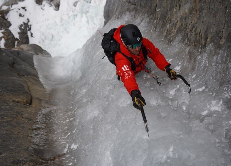 "Nos massifs Alpins sont des terrains de jeu uniques pour les passionnés d’escalade de glace & mixte. Dès les premières neiges en altitude, les faces se tapissent de glace et de neige au grès des conditions météorologiques formant des lignes éphémères, particulièrement esthétiques. Arrêtes effilées, couloirs de neige ou goulottes de glace !"